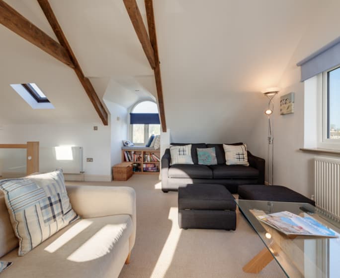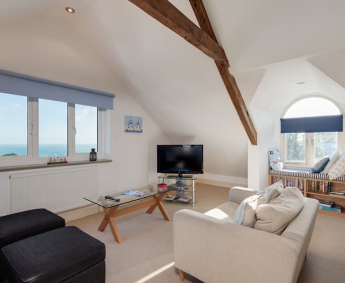 Benefits from triple aspect coastal and rural views, from the window seat and velux windows